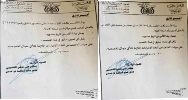 أصدر مدير عام شرطة العاصمة عدن اللواء الركن مطهر علي ناجي الشعيبي أمرين أداريين بتكليفان جديدة في قسم شرطة كابوتا.