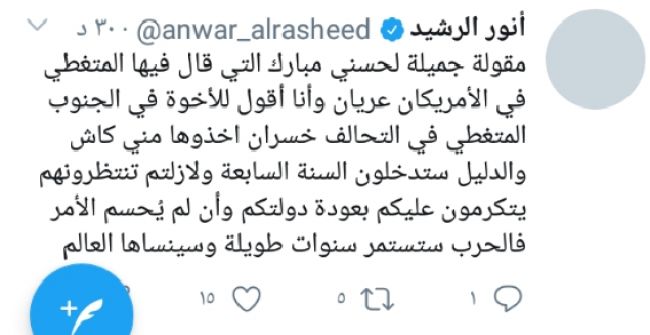 كتب رئيس المنتدى الخليجي لمؤسسات المجتمع الدولي الكاتب أنور الرشيد بقولة اقول للأخوة في الجنوب المتغطي بالتحالف خسران خذوها مني كاش والدليل على ذلك