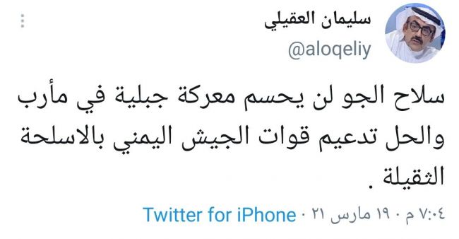 دعا السياسي السعودي المعروف سليمان العقيلي لدعم قوات الجيش الوطني بالأسلحة الثقيلة لحسم المعركة مع مليشيا الحوثيين.
