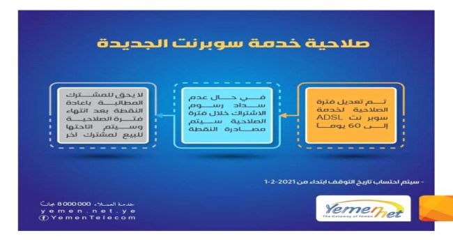 اطلقت مؤسسة الاتصالات اليمنية ومزود الانترنت السلكي الوحيد يمن نت اليوم الإثنين تحذيرا وتهديدا جديدا لمشتركي خدمة يمن نت، تهددهم بسحب نقطة الانترنت في غضون شهرين في حال لم يتم تجديد رسوم