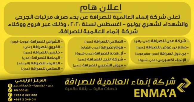 أعلنت شركة إنماء العالمية عن صرف مرتبات الوية الدعم والإسناد والأحزمة الأمنية يوليو / أغسطس.