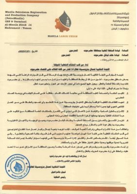 نتوجه إليكم في اللجنة النقابية لعمال بترومسيلة قطاع 14 بهذه الرسالة في ظل التوترات الراهنة التي تشهدها بعض مناطق حضرموت ، آملين من الله أن يحفظ المحافظة وأهلها من كل ما يمس أمنها