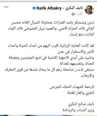 أدان معالي وزير الشباب والرياضة نايف صالح البكري، اليوم الخميس، العملية الإرهابية التي استهدفت قيادات الحزام الأمني في العاصمة اليمنية المؤقتة عدن، وأدت إلى استشهاد عدد من الجنود وإصابة