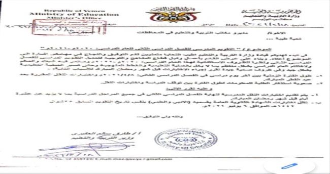 اصدر وزير التربية والتعليم طارق سالم العكبري تعميما الى مدراء مكاتب التربية والتعليم في المحافظات قضى بتعديل التقويم المدرسي للفصل الثاني للعام الدراسي 2020/2021م بإجراء الاختبارات قبل شهر