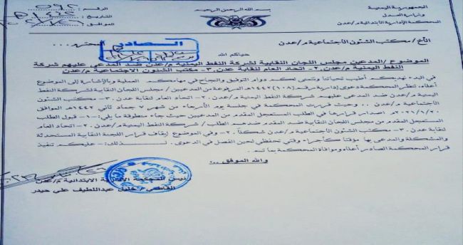طالبت المحكمة الإدارية الابتدائية م/عدن، مكتب الشؤون الاجتماعية والعمل، بتنفيذ حكمها الصادر بشأن دعوى قضائية بشأن اللجان النقابية في شركة النفط.