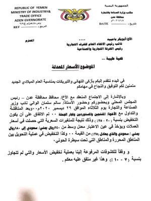 رضوان المسوريوجه مدير عام مكتب الصناعة والتجارة بعدن المهندس محمد عبادي مذكرة الى نائب الاتحاد العام رئيس الغرفة التجارية ابوبكر باعبيد، متوعدا التجار الغير ملتزمين والتي لم تتجاوز نسبة