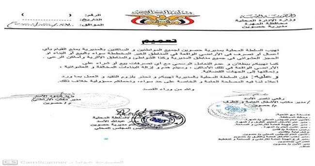 أصدرت السلطة المحلية بمديرية حصوين تعميماً بمنع أي تصرف بالأراضي الواقعة خارج المخطط.