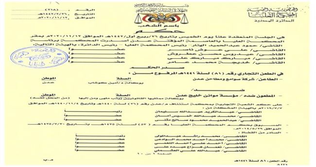 صدر حكم قضائي بـ 50 مليون دولار لصالح مؤسسة موانئ خليج عدن، في القصية المنظورة مع شركة صوامع ومطاحن عدن .وايدت المحكمة العليا الأحكام السابقة من المحكمة الابتدائية والاستئناف، باعادة ما لا
