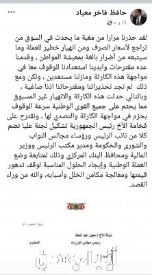 لقد حذرنا مرارا من مغبة ما يحدث في السوق من تراجع لأسعار الصرف ومن انهيار خطير للعملة وما سيتبعه من آضرار بالغة بمعيشة المواطن ، وقدمنا عده مقترحات وابدينا استعدادنا للوقوف معا في مواجهة هذه الكارثة ومازلنا مستعدين ، ولكن ومع ذلك لم تجد تحذيراتنا ومقترحاتنا اذنا صاغية ، وبالتالي حدثت هذه الكارثة والانهيار غير المسبوق مما يحتم على جميع القوى الوطنية سرعة الوقوف بحزم في مواجهة الكارثة والتصدي لها ، ونقترح على فخامة الأخ رئيس الجمهورية تشكيل لجنة عليا تضم كلا من نائب الرئيس ورؤساء مجالس النواب والشورى والحكومة ومدير مكتب الرئيس ووزير المالية ومحافظ البنك المركزي وذلك لمتابعة وضع العملة الوطنية وإيجاد الحلول المناسبة لوقف تدهور قيمتها ومعالجة مكامن الخلل وأسبابه، والله من وراء القصد.