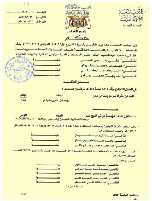 كما ألزم الحكم شركة صوامع ومطاحن عدن “بدفع جميع المبالغ التي في ذمتها لموانئ خليج عدن وتغريمها نفقات التقاضي لصالح مؤسسة موانئ خليج عدن، وقدرها بثلاثة مليون ريال”.