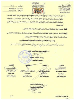 وايدت المحكمة العليا الأحكام السابقة من المحكمة الابتدائية والاستئناف، باعادة ما لا يقل عن 50 مليون دولار، لمؤسسة موانئ خليج عدن، مستحقات لها عن الفترة الماضية، إضافة إلى مستحقات المؤسسة خلال الفترة المقبلة، وفق العقد بين الطرفين.