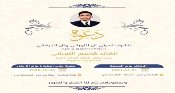 ألغى القيادي في أمن العاصمة عدن، قاسم الثوباني، مراسيم حفل زفافه التي كان مقرر لها، غدا الجمعة (الزفة)، وعصر الأمس (المقيل)، وذلك وفاء واحتراما لدماء شهداء وجرحى جريمة تفجيرات مطار عدن.