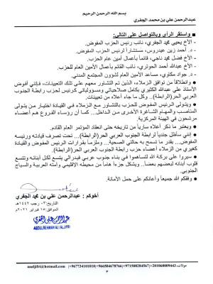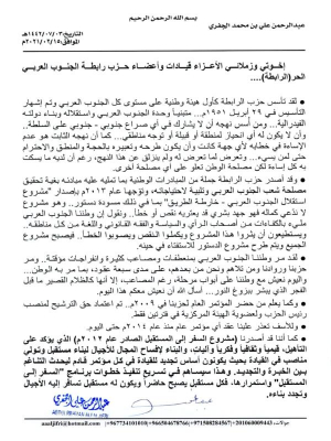 - تفويض الأخ علي عبدالله الكثيري برئاسة حزب رابطة الجنوب العربي الحر ونقل كافة الصلاحيات اليه.