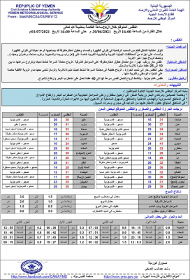 اصدر المركز الوطني للأرصاد اليمنية نشرته اليومية لأحوال الطقس المتوقع خلال ال24ساعة القادمة في مختلف مناطق الجمهورية.