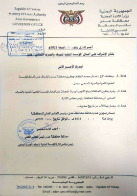 المحافظ احمد لملس يكلف وكيل المحافظة عدنان محمد الكاف بالإشراف على أعمال المؤسسة المحلية للمياه والصرف الصحي بالعاصمة عدن.
