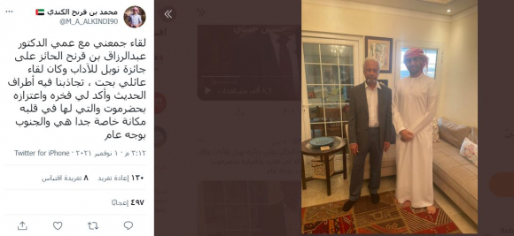 نشر احد النشطاء في موقع التواصل الاجتماعي تويتر صورة له مع عبدالرزاق قرنح الفائز بجائزة نوبل للاداب قبل نحو شهر وعلق عليها بالتالي: