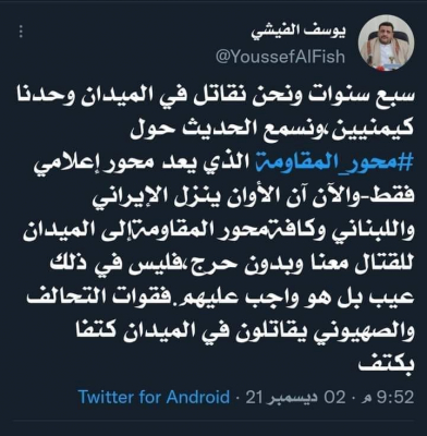 دعا القيادي الحوثي البارز يوسف الفيشي إيران ولبنان ومن أسماه "محور المقاومة" للقتال إلى جانب المليشيات الحوثية في اليمن.