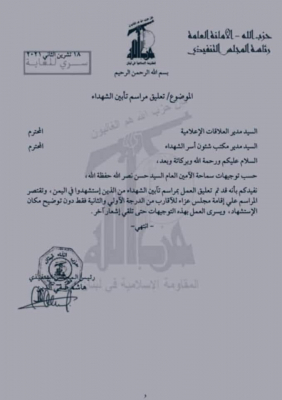 وتظهر الوثيقة، التي حصلت خبر للأنباء على نسخة منها، توجيهات صارمة من الأمين العام لحزب الله اللبناني حسن نصر الله تنص: "بتعليق مراسم تأبين الشهداء الذين استشهدوا في اليمن وأن تقتصر مراسم العزاء على الأقارب من الدرجة الأولى والثانية فقط دون توضيح مكان استشهادهم، ويسري العمل بهذه التوجيهات حتى تلقي إشعار آخر".