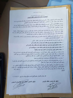 وعليه وبعد المشاورات مع القبيلة والنظر إلى العلاقات الأخوية التي تربطنا مع يافع فقد قررنا أن الثلث المتبقي من المبالغ المذكورة مع التسع القصاب آلي المتبقية فتعتبر مؤجلة ومطلوبة وملزمة على الضمين في حالة تكرار أي اعتداء على أهل حوشب او مطارحهم من قبل غسان او اي ناس تتبع له.