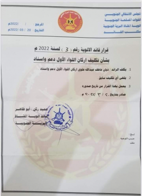 اصدر العميد ابو طاهر قائد الوية المشاة البرية الجنوبية قرارا قضى بتعيين الرائد ديان عاطف عبدالله علوي اركان اللواء الاول دعم واسناد.