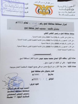 أصدر محافظ لحج اللواء أحمد عبدالله التركي تكليفا للاخ غسان محمد سعيد حيدر مندوبا للغاز بالمحافظة.