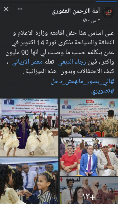 قالت الناشطة الإعلامية أمة الرحمن العفوري أنه بلغها أن وزارة الثقافة بقيادة معالي الوزير معمر الارياني خصصت 90مليون ريال لإقامة الحفل الفني بمناسبة عيد الثورة 14اكتوبر 1963 بقاعة الاتحادية في منطقة حقات صباح اليوم الخميس.