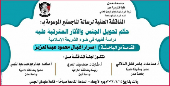 عن رسالتها حول حكم تغيير الجنس وآثاره: الماجستير بامتياز من جامعة عدن للباحثة/ إصرار إقبال محمود عبدالعزيز