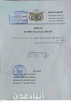 يكلف العميد طيار/حسين احمد محمد الجنيدي قائم باعمال مدير عام شرطة محافظة لحج، وعلى جميع الجهات المختصة العمل بموجبه.