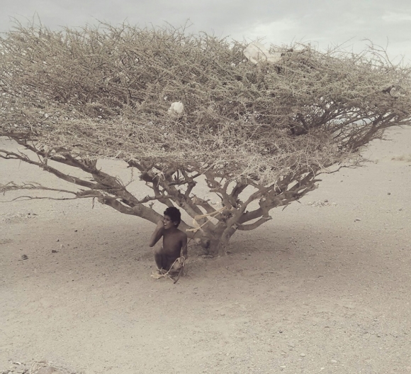 هذه الصورة لطفل نازح من محافظة تعز مديرية ذوباب يبلغ من العمر 14 عام فقد عقله نتيجة للقصف خلال الحرب التي شنتها ميليشيا الحوثي على مناطقهم .